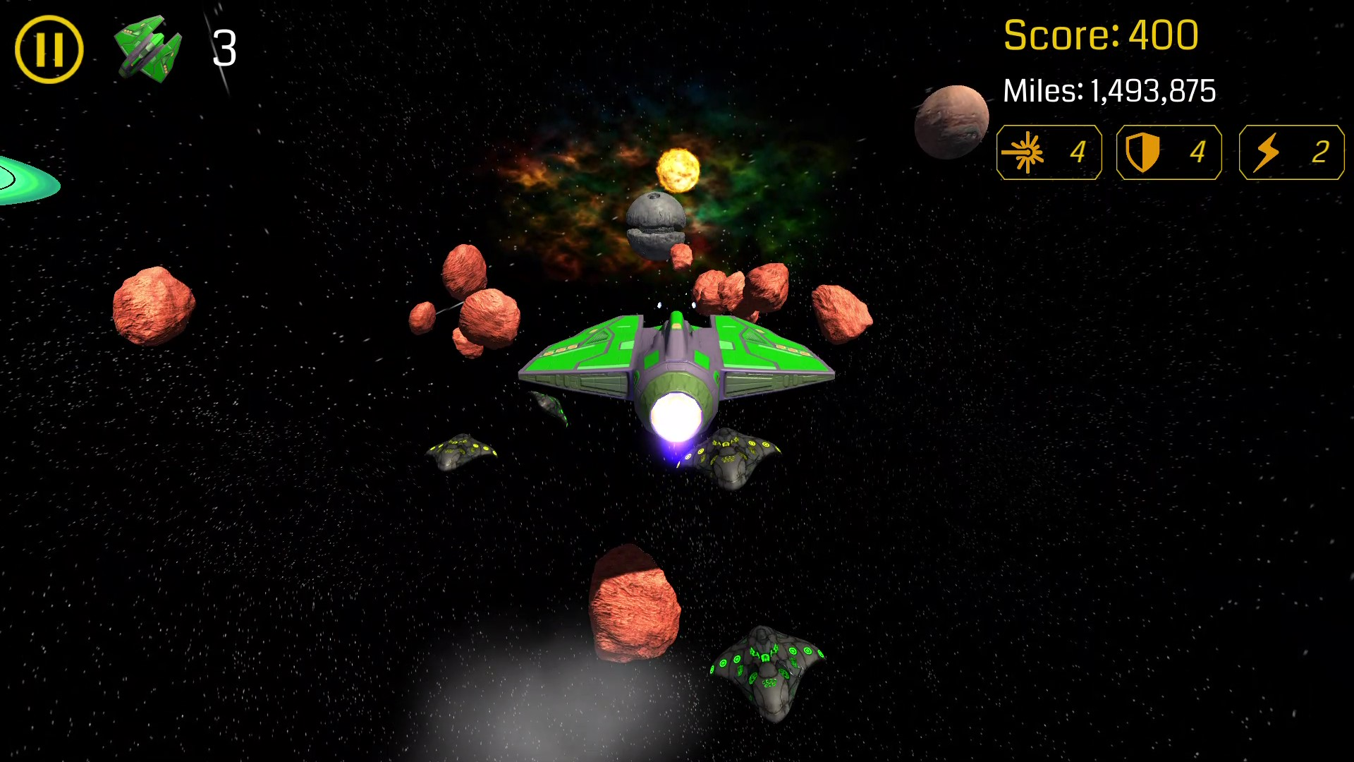This amazing star fighting game has very exciting game play, amazing space environments with great sounds, and a great user interface to let the fighters have wonderful experience. You can select the space scene, and your spaceship from several options. The controls are super handy and easy to use (motion sensors or swiping on the screen) to navigate your jet fighter spaceship.